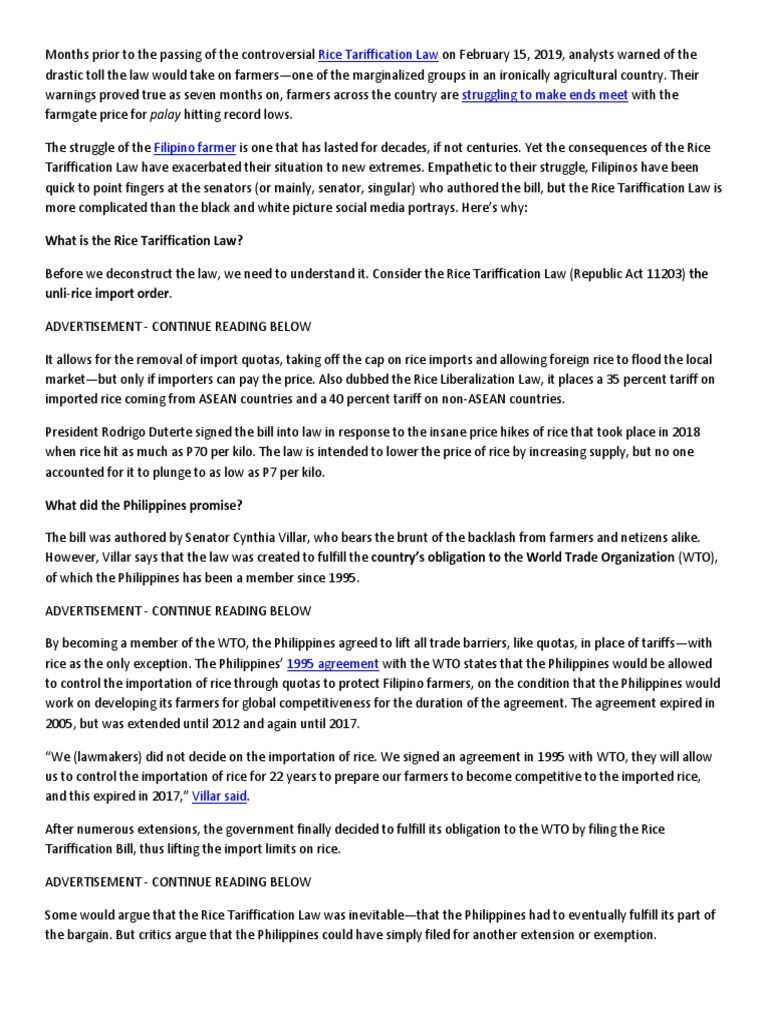 The rice tariffication laws also provides funding of p10 billion to provide seeds mechanization technical assistance and credit. The rice tariffication law rtl or republic act 11203 opens the philippine rice market and places a minimum 35 tariff on imported rice. The fuller importation of rice from other countries resulted in the plunging prices of local rice benefiting the rice eating populace but hurting the livelihood of many filipino farmers.